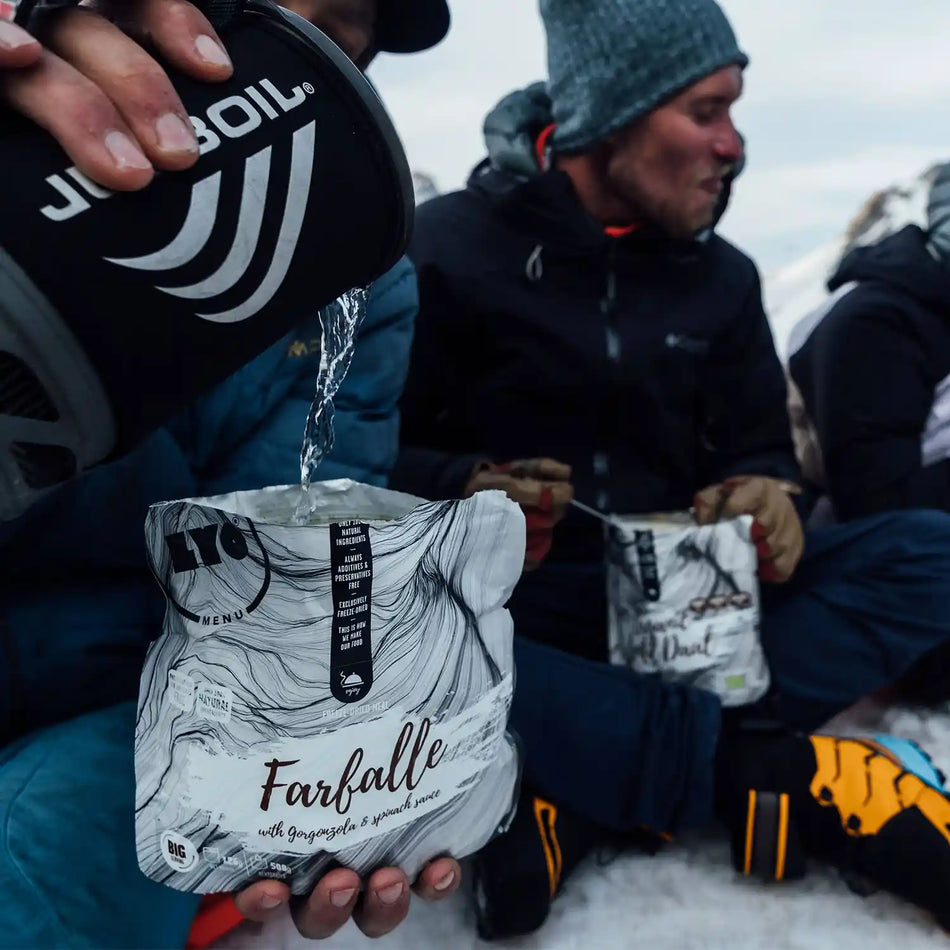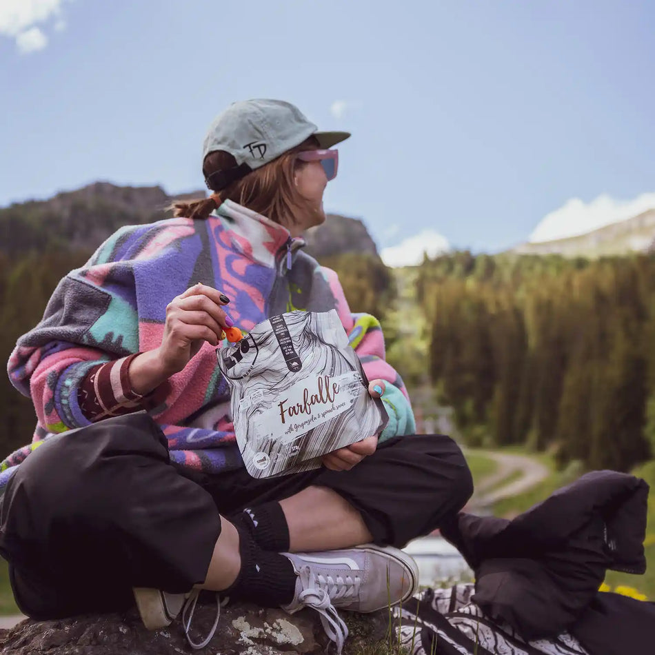 Farfalle, farfalloni, farfalline… Tous ces mots signifient « papillons », petits ou grands. Ces pâtes bien-aimées sont très appréciées pour leur surface délicate et leur forme ludique qui combine un centre assez gros avec des ails plus fins. On dit que grâce au grand nombre de textures, les farfalle se prêtent particulièrement bien aux sauces à la crème et nous sommes totalement d'accord là-dessus. Nous les avons imaginées dans un entourage italien classique : accompagnées d'épinards et de Gorgonzola, garnies de flocons d'amandes. Il semble que nous avons réussi, car les farfalle de LYO continuent à séduire les palais d'amateurs de plein air dès le premier jour, en leur donnant des ails où qu'ils aillent.